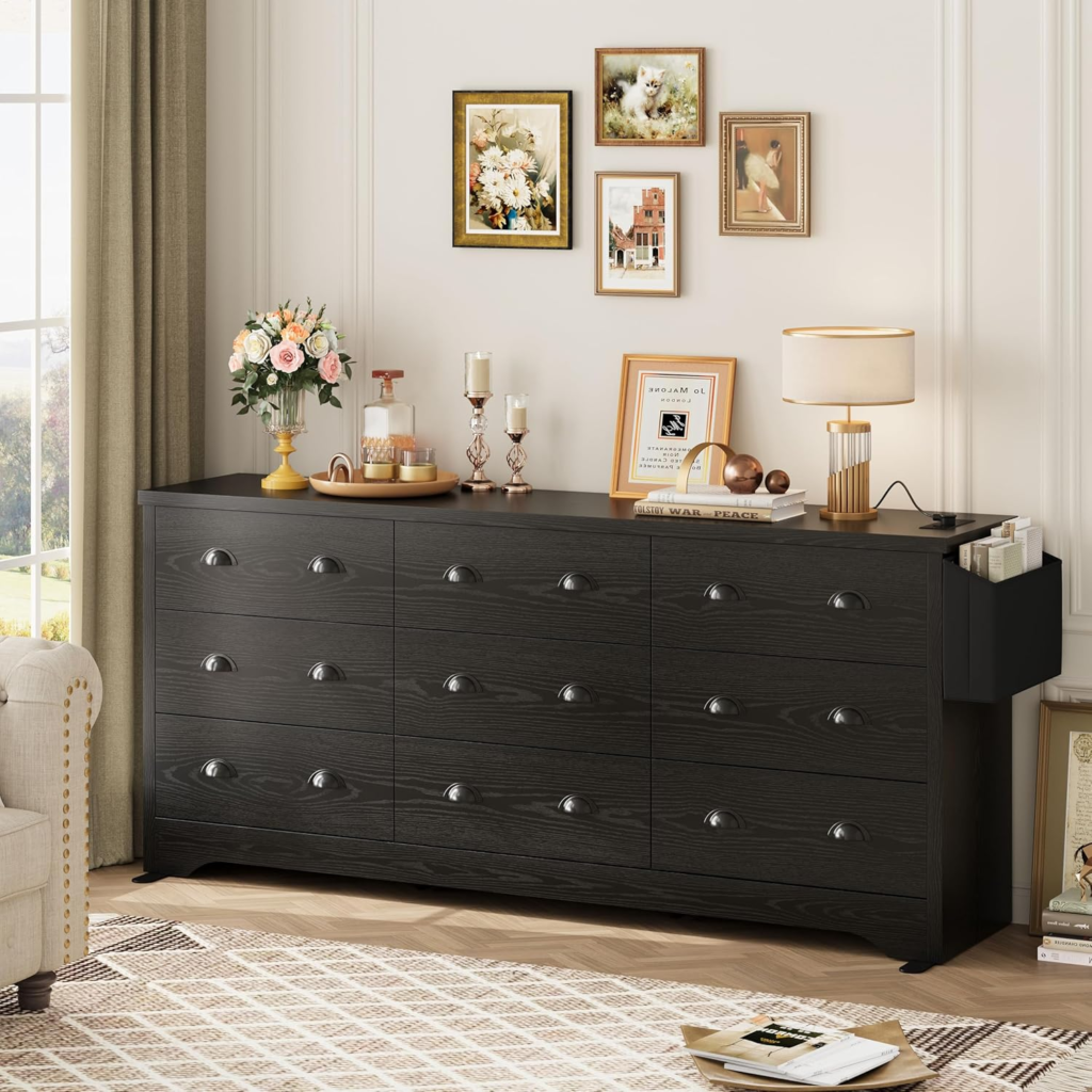 Ample Storage: With 9 spacious drawers, this dresser offers generous storage for all your needs. The wide drawers are designed for easy access and organization, making it a practical addition to any room
